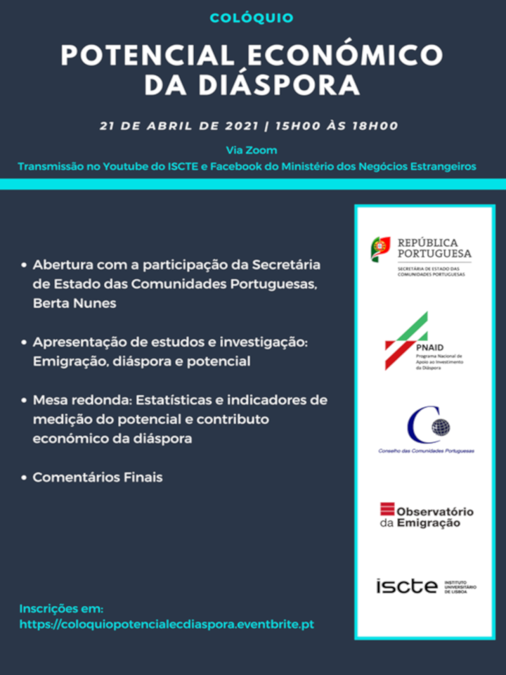 O Colóquio "Potencial Económico da Diáspora" tem por objetivo identificar e promover estudos, investigação e estatísticas que permitam conhecer melhor o contributo e potencial da diáspora portuguesa nas diversas vertentes: empresarial, turística, financeira e tributária. É promovido pela Secretaria de Estado das Comunidades Portuguesas do Ministério dos negócios Estrangeiros (SECP-MNE), em parceria com o Observatório da Emigração (ISCTE-IUL) e o Conselho Regional das Comunidades Portuguesas na Europa (CRCPE).