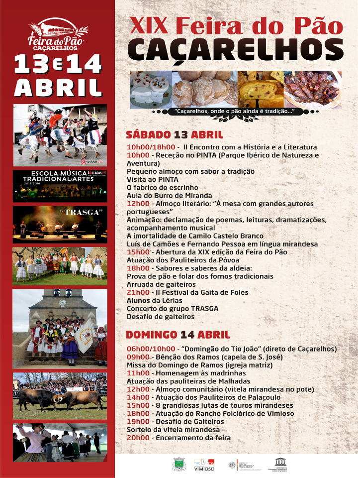 Marque já na sua agenda os dias 13 e 14 de abril, venha a Caçarelhos provar e comprar o melhor pão de trigo ou centeio, os folares e toda a doçaria tradicional da Páscoa. Com mais de 40 expositores pode encontrar os melhores fumeiros regionais do Planalto Mirandês, queijos, mel biológico, azeite e frutos secos, produtos da horta, compotas e licores confecionados com os produtos da terra e métodos tradicionais, grande variedade de artesanato, mobiliário rústico, entre muitos outros produtos de qualidade. No sábado a gaita de fole será rainha. Esperamos mais de 100 gaiteiros provenientes de diversas localidades do norte de Portugal e Espanha (veja o cartaz temático), venha à arruada de gaiteiros e ao concerto dos TRASGA. Também pode comprar a sua gaita nesta feira e ser mais um gaiteiros a tocar. No domingo pode saborear a carne mirandesa no pote e, seguidamente, assistir a 8 grandiosas lutas de touros, com magníficos animais, onde estarão os campeões em título dos campeonatos de Vinhais e Bragança e os melhores exemplares da raça mirandesa dos últimos anos, uma verdadeira chega de campeões "A FORÇA E A BELEZA DA RAÇA MIRANDESA". Veja o nosso cartaz, a diversidade de atividades onde folclore, pauliteiros e pauliteiras não vão faltar. Venha apreciar a qualidade dos produtos da nossa feira. Na companhia da simpatia das nossas gentes divirta-se e faça as suas compras de Páscoa. Nos dias 13 e 14 de abril "TODOS OS CAMINHOS VÃO DAR A CAÇARELHOS, ONDE O PÃO AINDA É TRADIÇÃO".