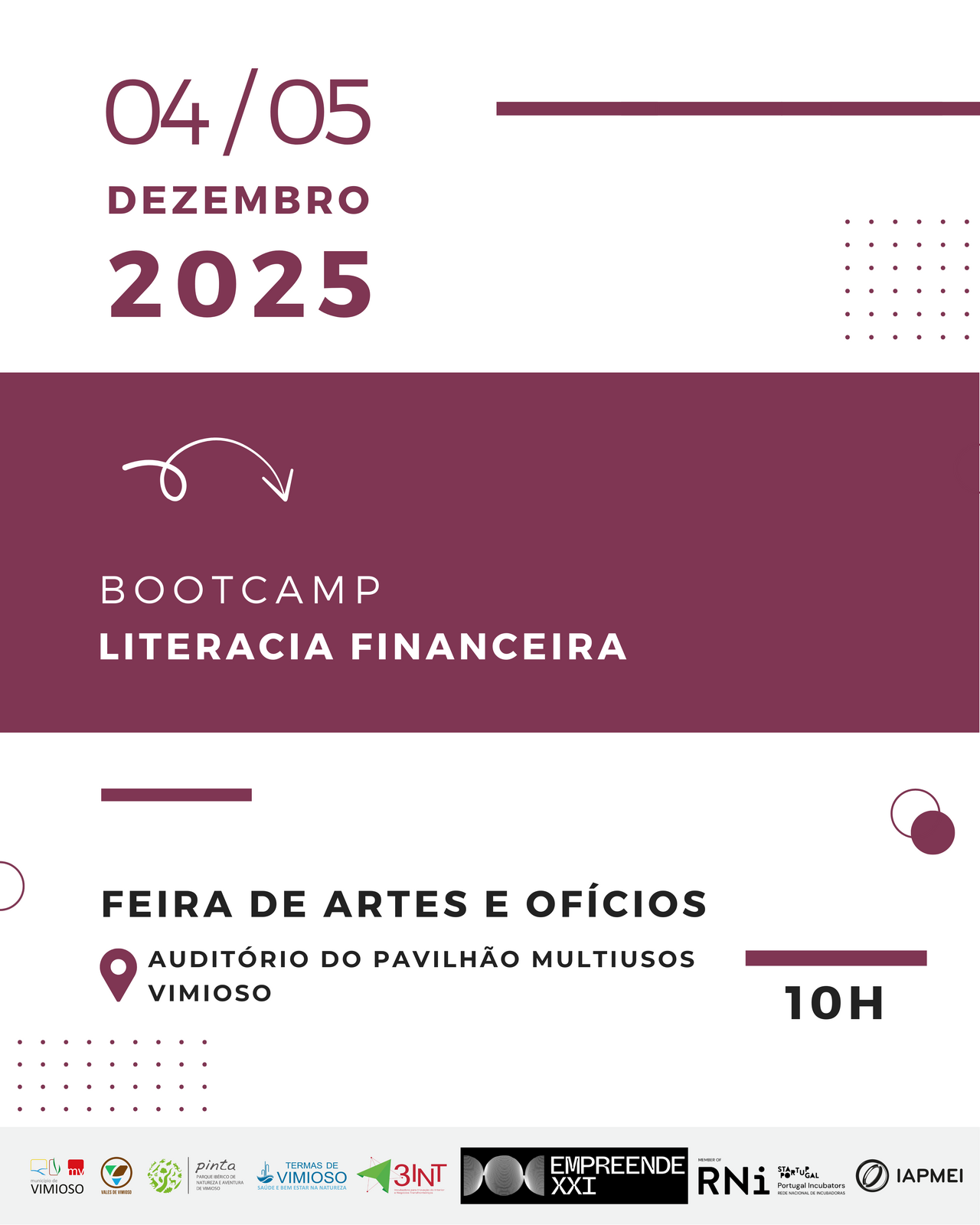 Nos dias 04 e 05 de dezembro, na Feira de Artes e Ofícios teremos o Bootcamp sobre Literacia Financeira. Vem aprender a organizar as tuas finanças e a tomar decisões mais informadas.